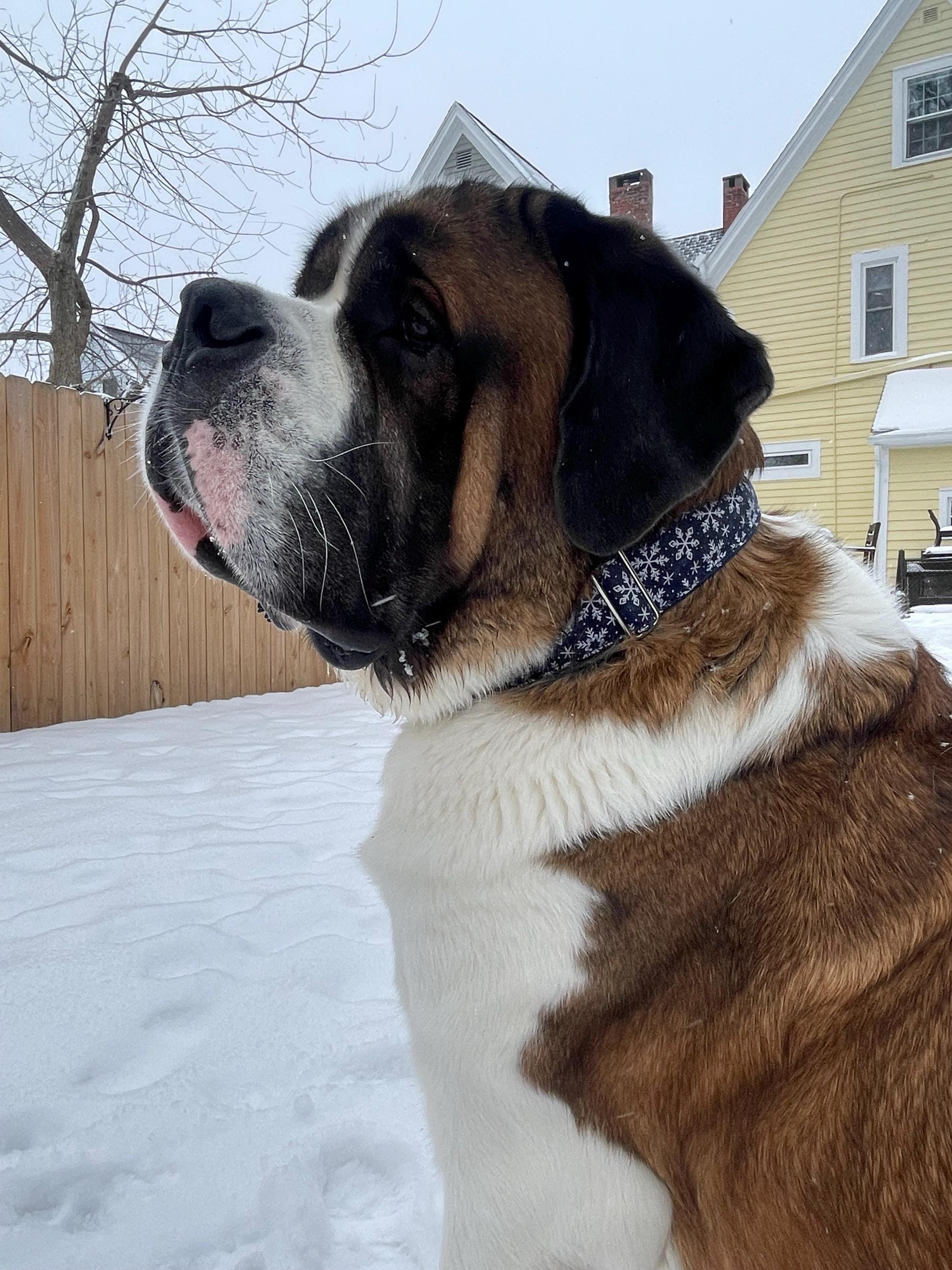This collar is awesome! I ordered the 2” on navy webbing with chrome hardware. The color is a vivid, rich navy with bright white snow flakes. The quality is amazing and I know it will last on my very large, very active St. Bernard! We get a ton of compliments on it around the neighborhood and at doggy day care! It is absolutely perfect for my Saint in January, in Buffalo!!