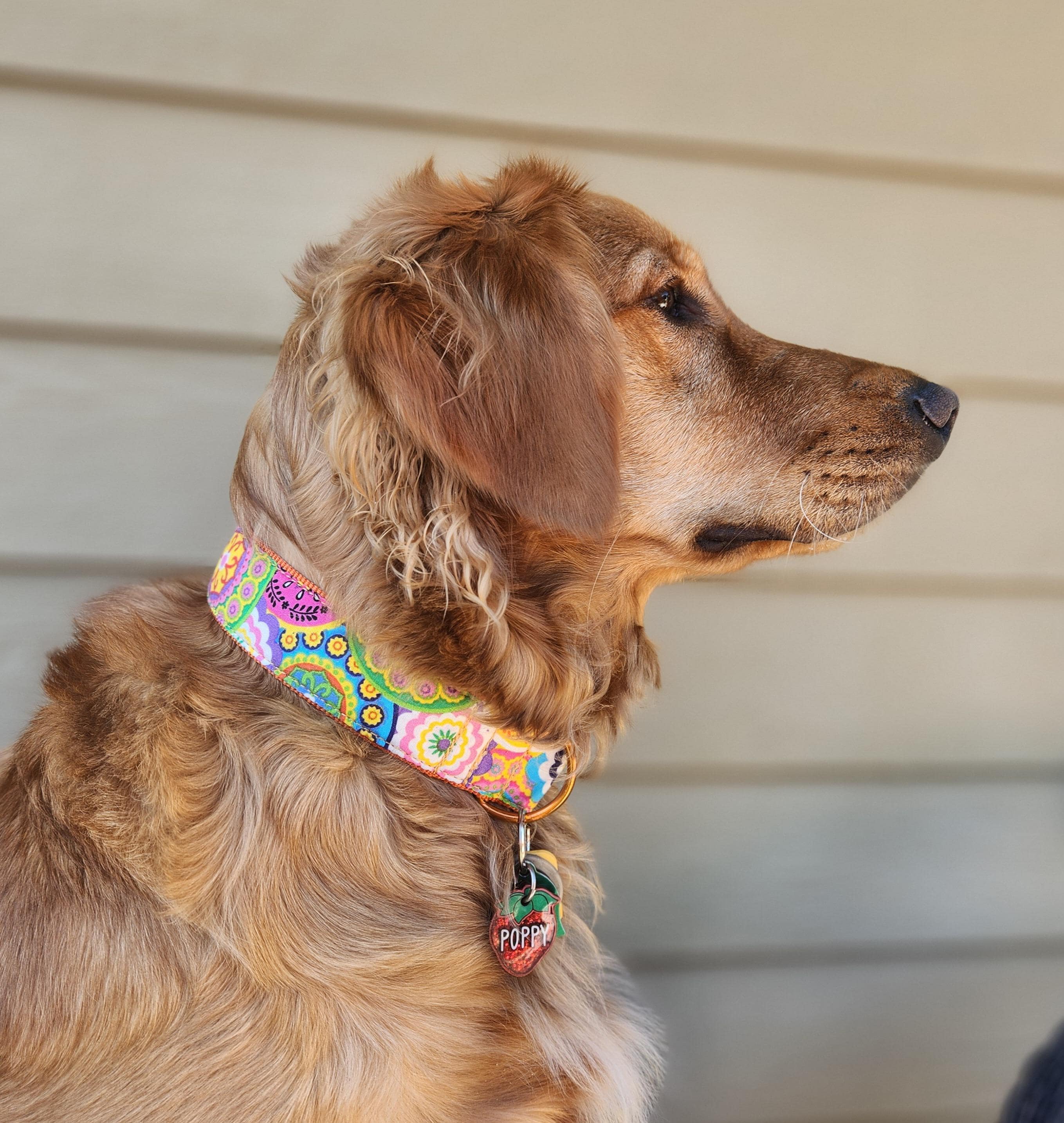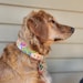 COLLAR WIDTH and BUCKLES: This collar can be made with a plastic side-release buckle in 1”, 1.5”, or 2” widths, just know that the wider collars show more of the pattern and the narrower widths are cropped down to that width. Pro-tip for choosing your collar width: If you are unsure of which width to order your collar, cut a strip of paper to either 1”, 1.5”, or 2” wide and lay it against your puppy’s neck and see how it looks. It doesn’t have to be long enough to go all the way around the neck, just to get a feel for the collar width.
